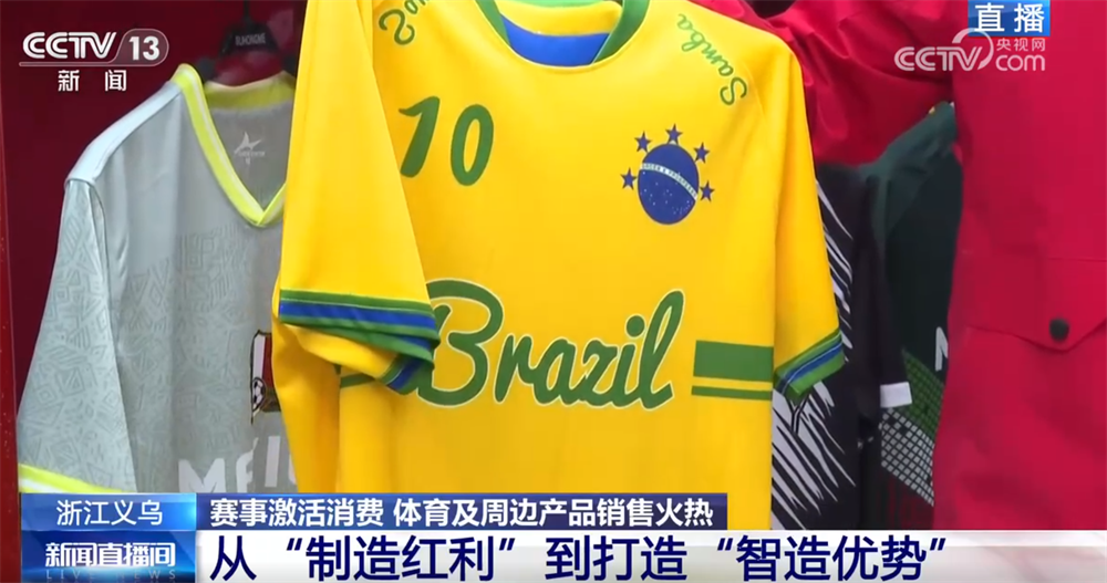 记者现在在义乌国际商贸城三区的体育用品专区,这家商户主营的是足球球迷服,大家还记得四年前的卡塔尔世界杯吗?当时这家店的老板通过观察各个参赛队球迷服的订单走势,特别是赛前那一波波的追单情况,成功预测了阿根廷队会夺冠!您看,体育经济和义乌市场之间就这样有了一次特别巧妙的联动。